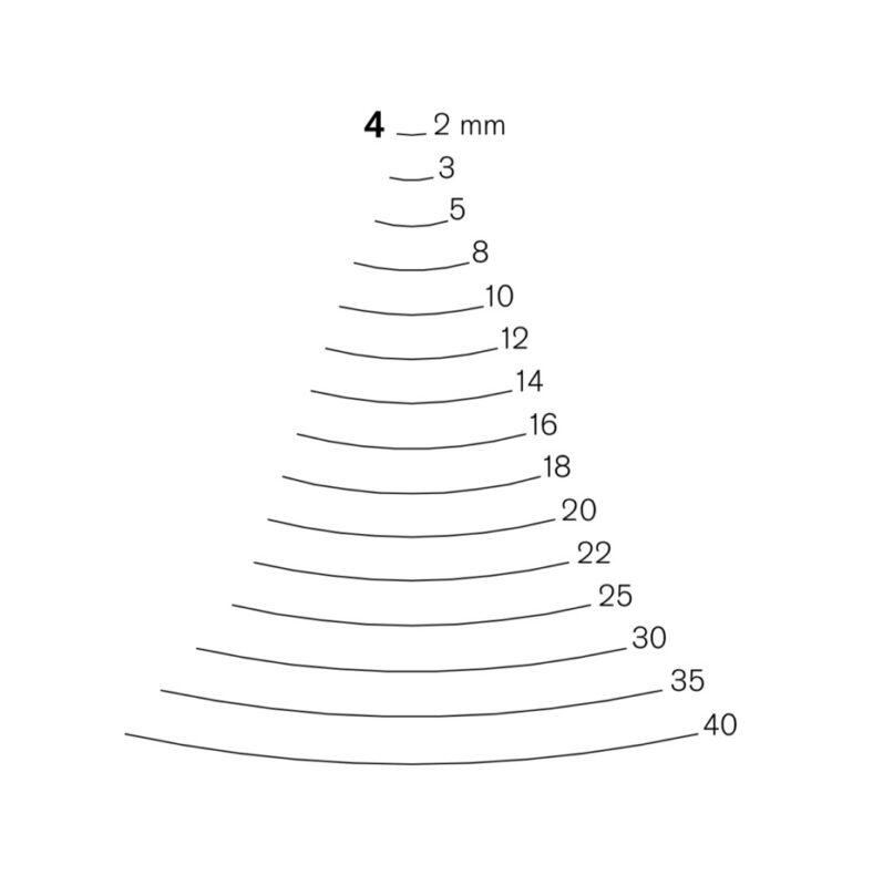 Pfeil’s standard sized tools are 10″ in length. Most of Pfeil’s part numbers are made up of 2 numbers, divided by a slash. The number before the slash is the tool’s profile number – in other words, the shape of the blade. A #1 is a flat tool, like a chisel or skew. As the numbers increase up to #11, the curve of the tool increases. An #11 is a full U shape.