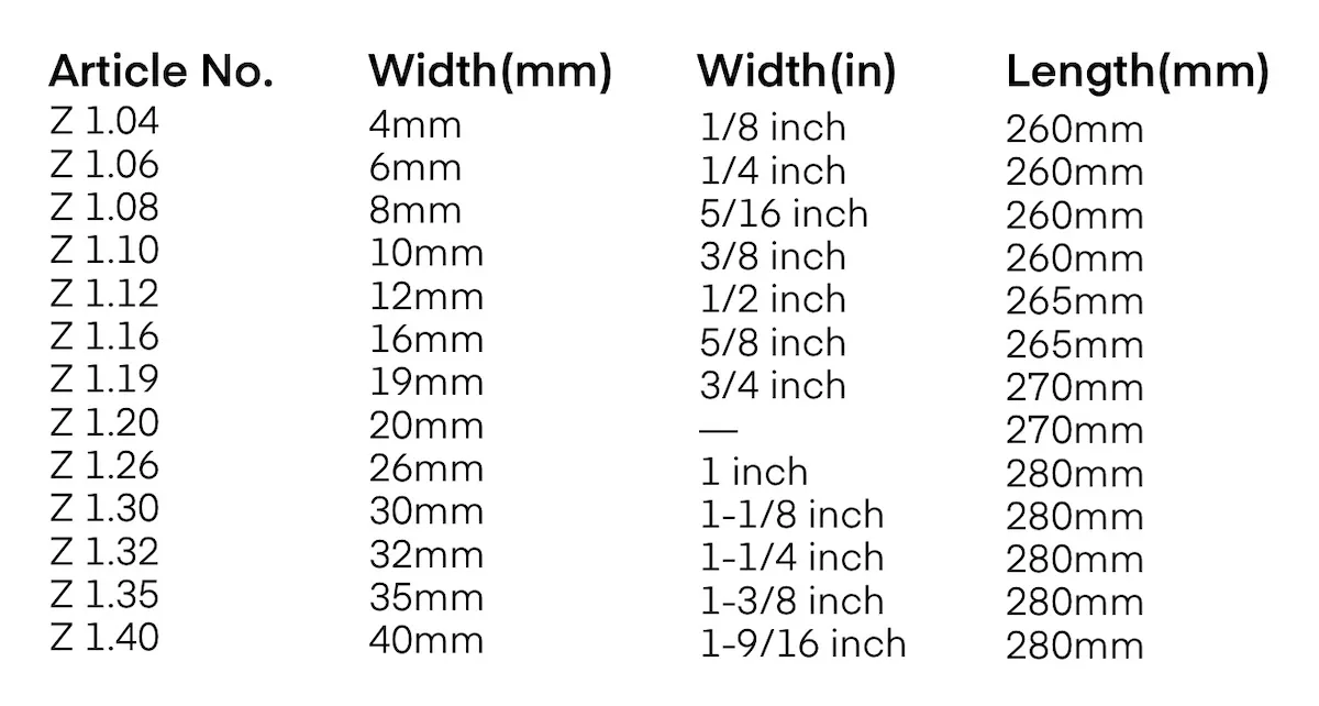 SizeZ-4mm (1/8”), Z-6mm (1/4”), Z-8mm (5/16”), Z-10mm (3/8”), Z-12mm (1/2”), Z-16mm (5/8”), Z-19mm (3/4”), Z-20mm, Z-26mm (1”), Z-30mm (1 1/8”), Z-32mm (1 1/4”), Z-35mm (1 3/8), Z-40mm (1 9/16”)