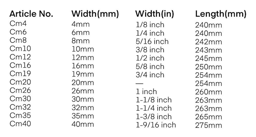 SizeCM4, 4mm, CM6, 6mm, CM8, 8mm, CM10, 10mm, CM12, 12mm, CM16, 16mm, CM19, 19mm, CM20, 20mm, CM 26, 26mm, CM30, 30mm, CM32, 32mm, CM35, 35mm, CM40, 40mm