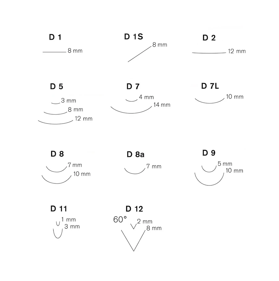 Contains the following “D” intermediate size tools (these are approx. 8″ long, vs the standard 10″ length of the full size tools). The D tools are popular for carvers with smaller hands. The quality of the tool and steel is the same as the full size tools.