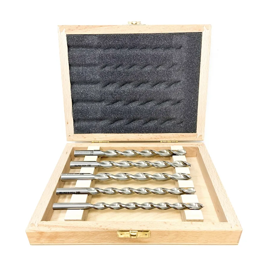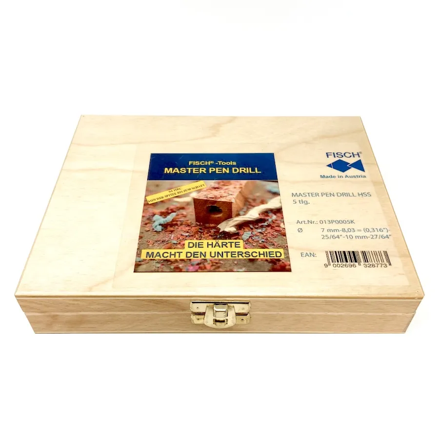 The FISCH HSS 5 pc Pen Drill Set Set is made of European M2-High Speed Steel, shank is hardened twice for longer service life, the cutting edge geometry and flute design guides the bit straight in end grain and guarantees a clean entrance and exit hole.