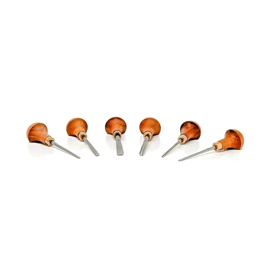 Carving tools should be handled with care. They should be stored in roll-up cases, wooden boxes or wall-mounted tool racks. The tools should not be allowed to fall on the floor or impact one another. This will avoid mistakes when cutting and also injuries. In order to prevent corrosion (rust etc.), the tools must be stored in a dry room. For longer periods of storage, it is recommended that the tool blades are protected with a thin coat of light oil.