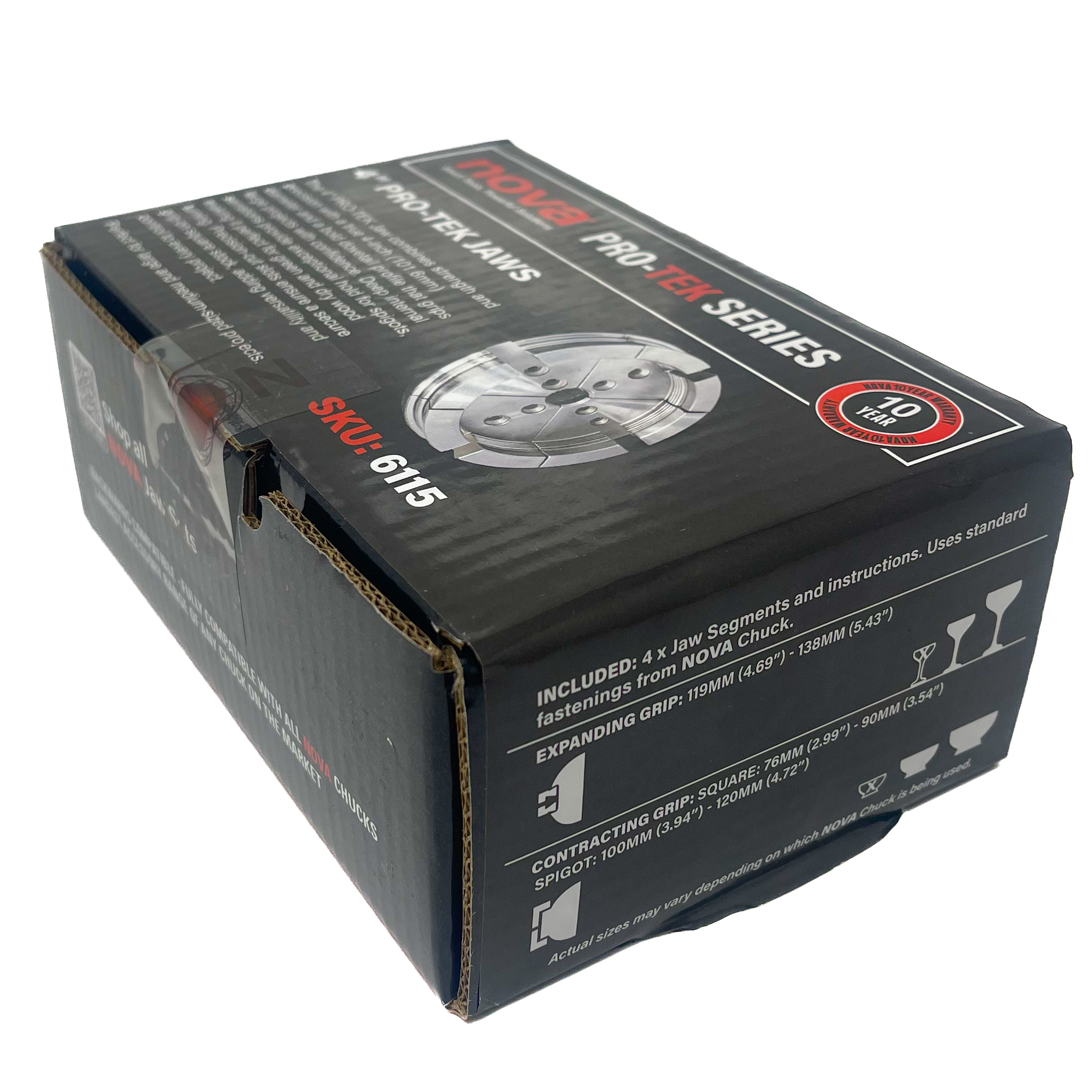 The NOVA 6115 4″ Pro-Tek Jaws round out the PRO-TEK lineup as the largest Hornung-style offering designed for users tackling large forms or expansive surfaces. With a robust dovetail and serrated grip profile, it prioritizes firm holding power and wide-surface contact. It’s the ideal solution for heavy or wide spigot work where maximum stability and control are non-negotiable.The 4″ PRO-TEK Jaw combines strength and precision with a true 4-inch (101.6mm) diameter and a bold dovetail profile that grips large projects with confidence. Deep internal serrations provide exceptional hold for spigots, making it perfect for green and dry wood turning. Precision cut slots ensure a secure grip on square stock, adding versatility and control to every project.Perfect for large and medium sized projects.- The NOVA PRO-TEK 4in Jaw Set with true dovetail profile, designed for maximum strength and holding in wood turning, without crushing wood fibers