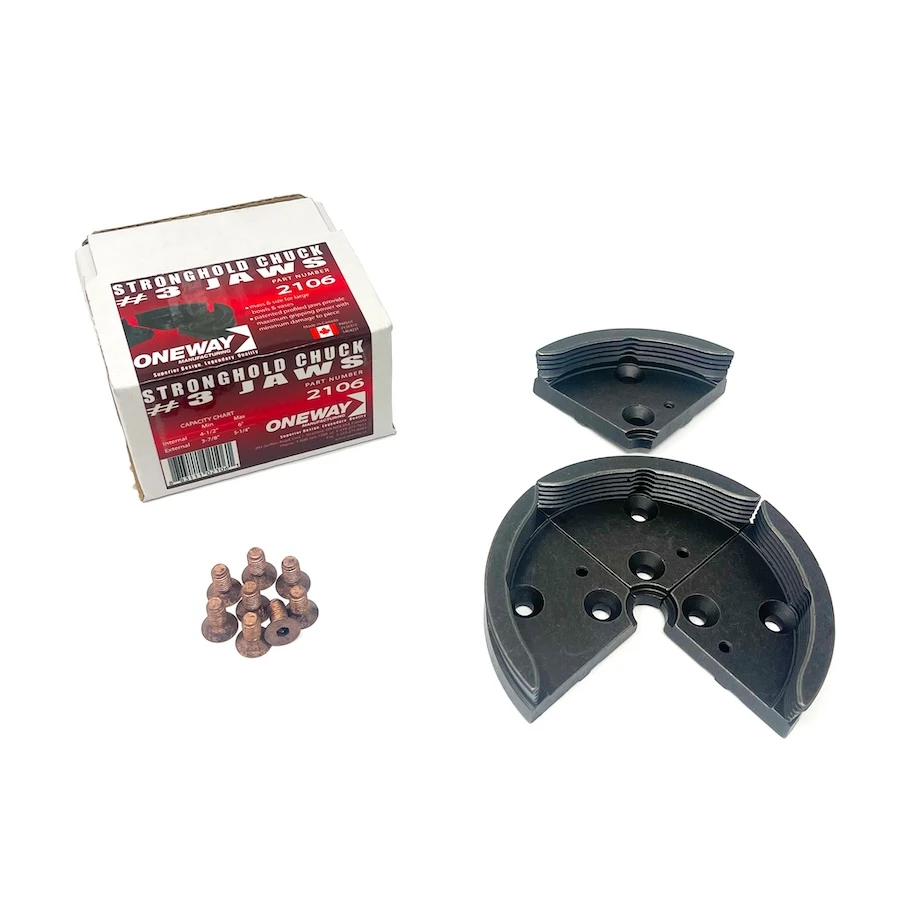 The ONEWAY #3 Profiled Jaws For Stronghold Chuck are a bit bigger than the standard #2 jaws, offering more holding power on larger work pieces. featuring ONEWAY’s unique serrated profile, these jaws offer incredible holding power across the whole range of the chuck.