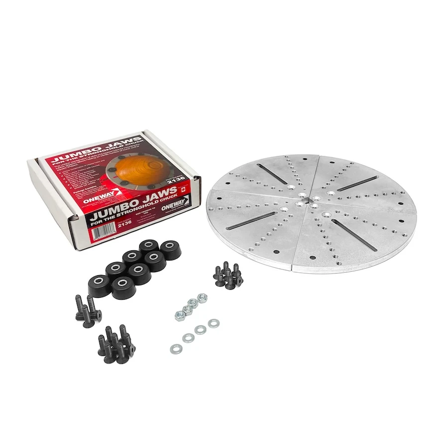 The ONEWAY Jumbo Jaws For Stronghold Chuck are aluminum plates machined from a solid (for greater strength). Their unique combination of slots and tapped holes for mounting the rubber grippers allows holding an infinite number of round, oval or square shapes. The buttons are hard rubber pressed over a tapered steel sleeve for superior holding.