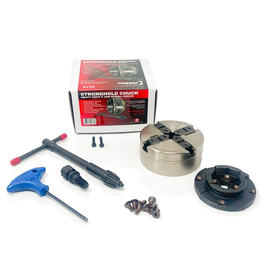 The Oneway Stronghold Chuck is equipped with oneway’s patented profile top jaw shape. This shape increases gripping power at all diameters of round and square stock. Less wood damage also occurs with this jaw shape than with the conventional round shaped jaws. Designed and manufactured in Canada with excellent materials and well engineered features, this chuck is a favourite among many of our local turners who have been waiting patiently for us to carry the Oneway lineup.