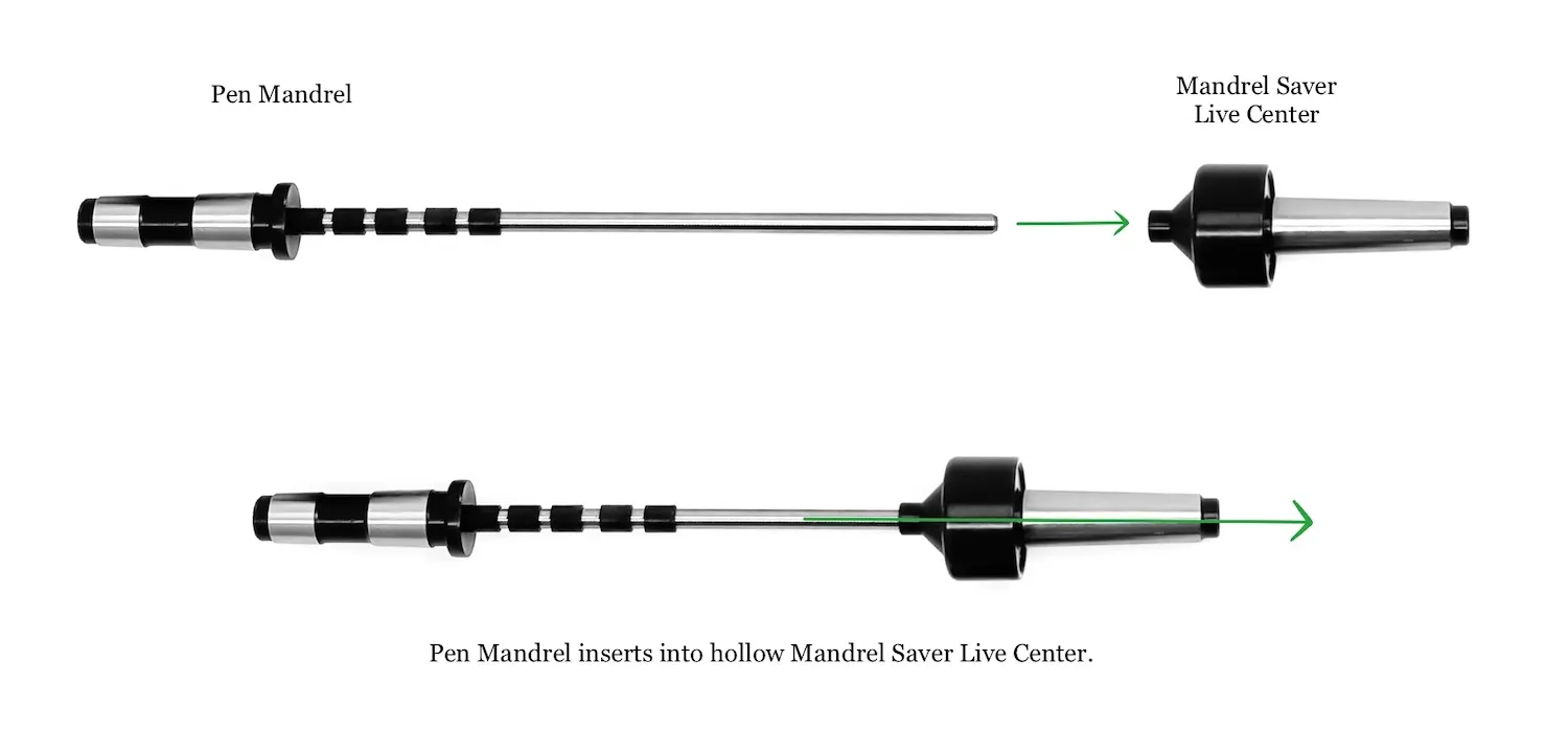 First, let’s talk about traditional live centers. Traditional live centers work by exerting direct pressure from the tailstock onto the end of your work piece (in this case, the pen mandrel with your pen blank on it) via a point or a crown, rotating with your project and keeping it secured on the lathe. They work extremely well in many, if not most, woodturning applications. While a traditional style live centre can be used during pen turning, over time it can lead to bending or damage to the mandrel, especially when excessive pressure is applied from the tailstock.